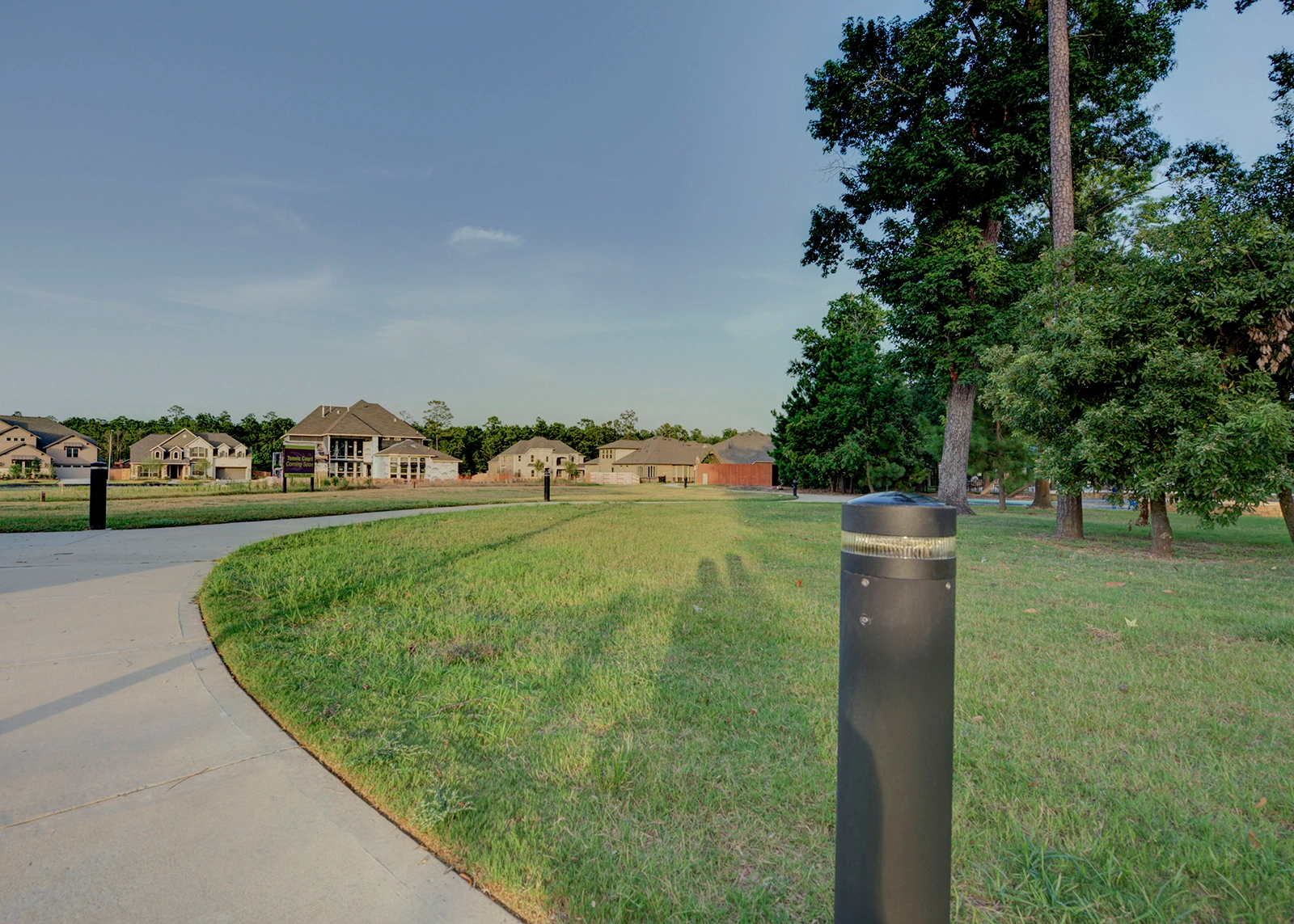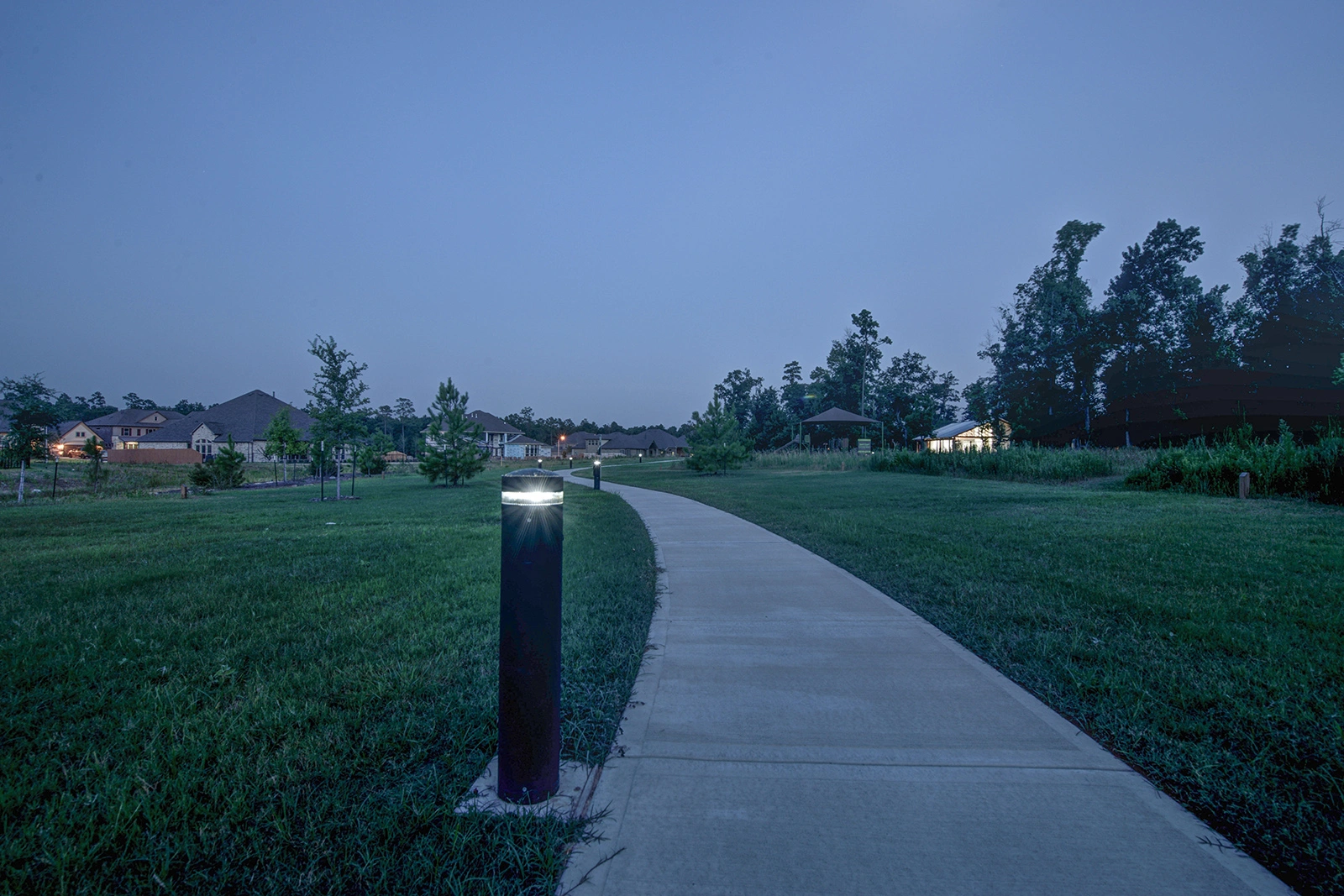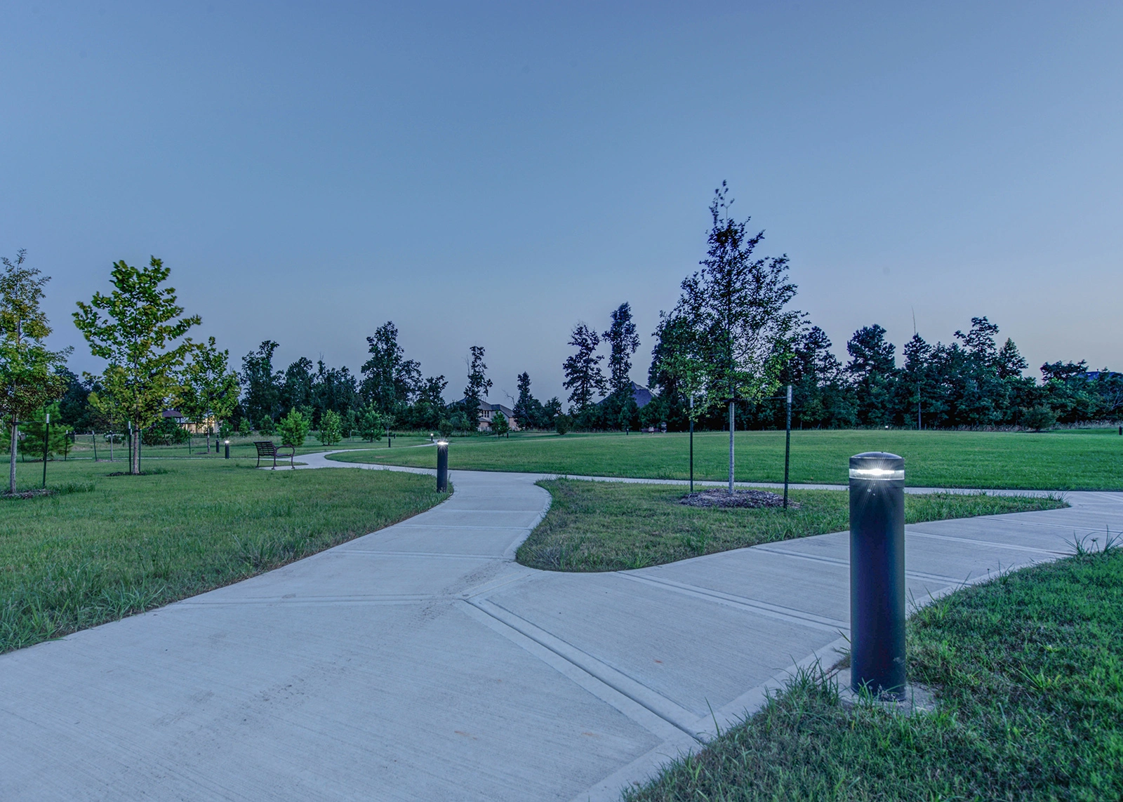 At Harmony Linear Park, Exteria's SP‑010 Solar LED Bollards guide visitors along meandering pathways while preserving the park's natural serenity. The fixtures blend perfectly with the landscape, their subtle design complementing greenery, water features, and open spaces rather than overpowering them.